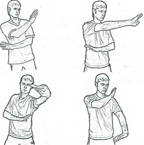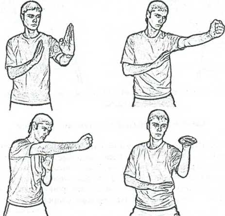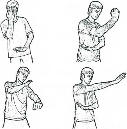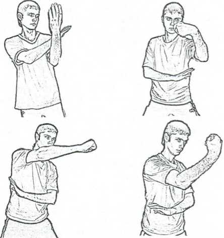 Рис. 2.14. Различные варианты стойки со скрещенными руками и возможные удары.