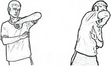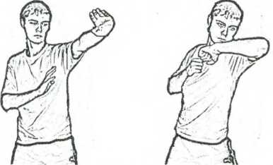 Стойка с локтевой защитой - защитная стойка (рис. 2.12). Позволяет сдерживать натиск противника локтевыми блоками. Удары противника натыкаются на локоть, что травмоопасно для бьющей руки противника. При этом создает условия для круговых ударов левой рукой в голову или пах (удар-молот), локтевых ударов, рубящих ударов ребром ладони.