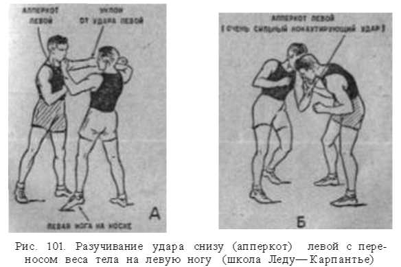 Удары снизу (международное название «апперкот») подразделяются на удары, наносимые с переносом веса тела на ногу (или под шаг этой ногой), одноименную бьющей руке (рис. 101), и удары с переносом веса тела на разноименную ногу.