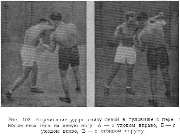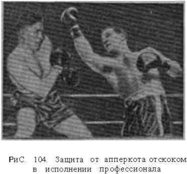 Защит от ударов этого вида немного и надежных почти нет. Сама дистанция между противниками бывает так коротка, что обычно удар доходит до цели раньше, чем защищающийся успеет принять какие–либо меры. На средней или дальней дистанции в момент сближения боксер с быстрой реакцией еще успевает сделать защитные движения типа накладок, остановок или толчков в плечевой сустав, парализующих действия противника в момент удара; в этих случаях удар может не достигнуть цели или пройдет мимо. Возможна также защита отскоком (рис. 104).