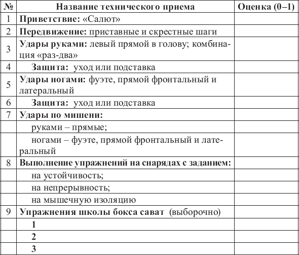 Во время проведения условного «боя» следует не допускать возможность реального нанесения ударов. Атаки одиночными ударами, защиты от них и контратаки производятся по полной амплитуде, в двух вариантах: без касания и с остановкой ударной конечности у самой цели; или медленно и с «прижимом» по цели. Схема квалификационных требований по программе «Дебютант» представлена в таблице.