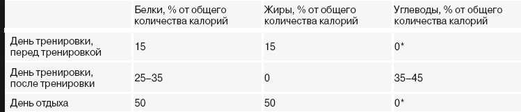 Говоря о трех основных питательных веществах – белках, жирах и углеводах, – мы начинаем с белков. Вы должны потреблять 1 грамм белков на 0,5 килограмма своего целевого веса тела (то есть веса, который вы хотите получить в итоге). Эта величина остается постоянной в дни тренировок и дни отдыха. В дни отдыха примерно половину вашего дневного рациона должны составлять белки, а вторую половину – жиры. В дни тренировок белки также должны составлять примерно половину вашего дневного рациона, но примерно 70 процентов всех калорий вы должны получать после тренировки. Это значит, что вы также должны получать немало углеводов. Придерживаясь данной схемы, вы можете самостоятельно определить, сколько граммов углеводов и жиров вам нужно получать. Общий план приведен ниже: