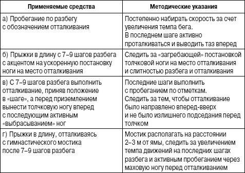 Таким образом, разбег – ответственная часть прыжка в длину, которая в значительной мере определяет результат. Эффективность действий прыгуна в разбеге заключается в развитии наибольшей скорости бега на последних 2–4 шагах при сохранении способности к отталкиванию.