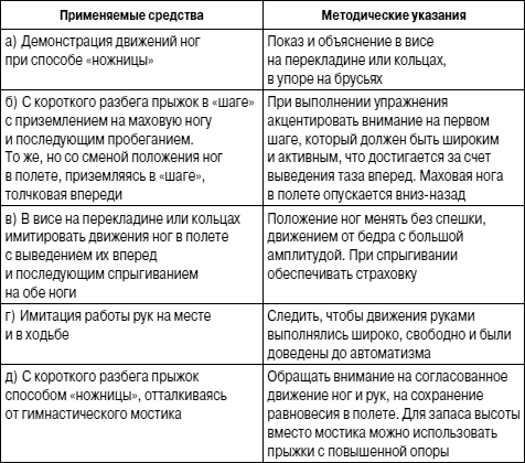 Прыжок способом «ножницы». При этом способе прыжка бег и полет являются как бы единым двигательным актом, объединенным аналогичной ритмовой структурой, т. е. спортсмен наиболее естественно переходит от разбега к прыжку, как бы продолжая во время полета беговые движения. Стиль «ножницы» также создает оптимальные условия для сохранения равновесия в полете, что позволяет преодолеть горизонтальное вращение тела после отталкивания и обеспечивает удобную позу для приземления.