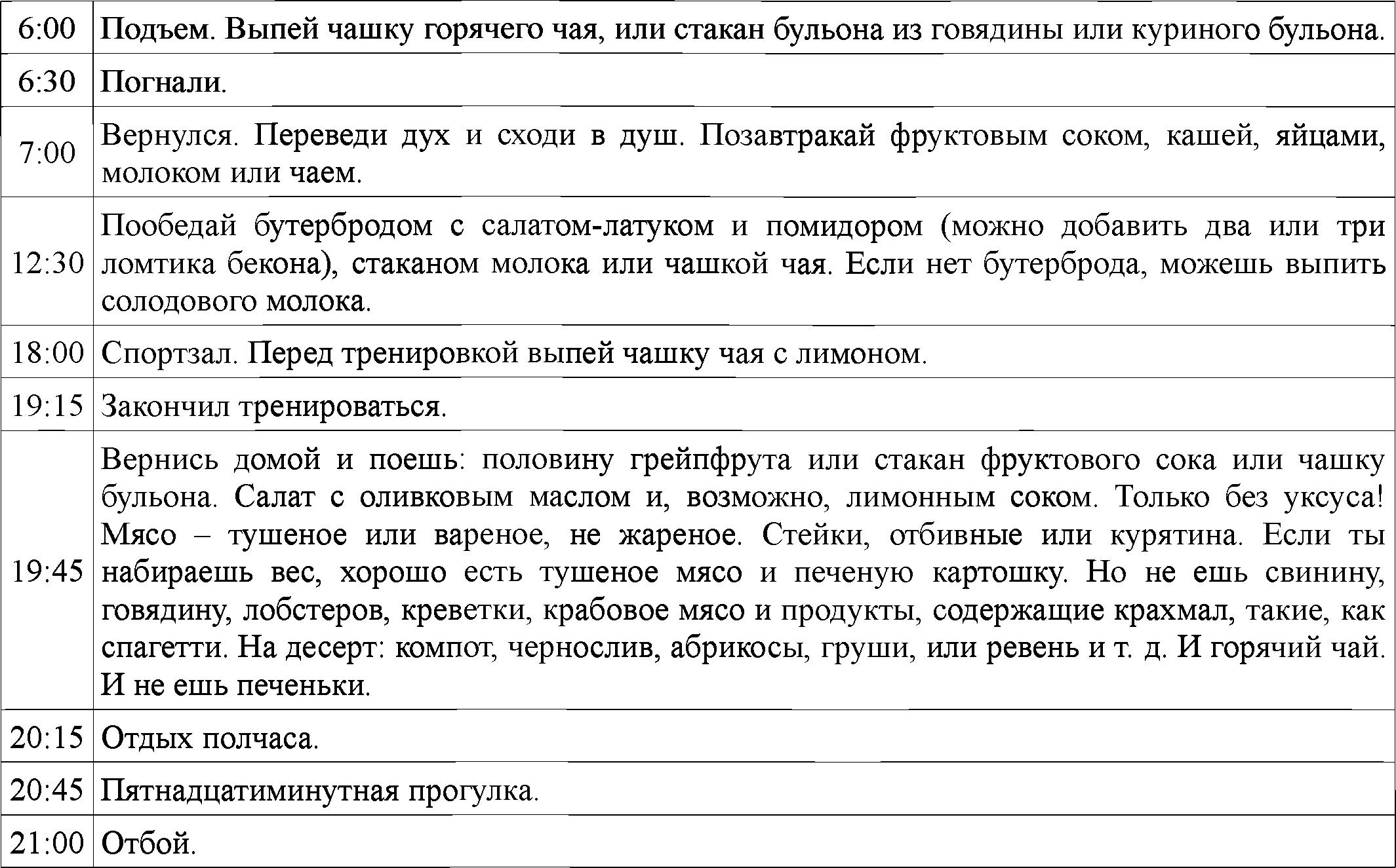 Диета у любителя примерно та же, что у профессионала, но график у профи гораздо проще с точки зрения времени. Пробежка с 5: 30 утра. Вернувшись в лагерь, он может отдыхать до 10 часов, когда у него завтрак. Затем он бездельничает до полудня, потом может пообедать или вздремнуть, в зависимости от его веса. Он начинает свою тренировку в 14: 30. Потом он бьет баклуши до ужина, то есть, до 17: 00 или 17: 30, затем может балдеть или чем-нибудь заняться до 22: 00 часов вечера, потом ложится спать.