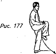 Движение 1 (продолжает рис. 176): Согните правую ногу в колене, удерживая ее бедро параллельно земле, а носок оттяните вниз. Перенесите левую ладонь к правой, а затем обе руки по кривой опустите по обе стороны правого колена, ладонями вверх (рис. 177).