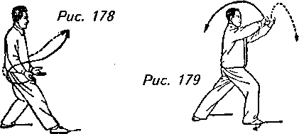 Движение 2: Опустите правую ногу на землю и перенесите на нее тяжесть своего тела, переходя на правый “шаг вдоль кромки радуги”. Сожмите пальцы в кулаки и разведите их в стороны, перемещая их вперед и по окружности, сводя их вместе, как щипцы, на уровне глаз, с ямками в кулаках (образованными большими и указательными пальцами на каждой руке), направленными под углом вниз. Расстояние между кулаками должно быть около 6 дюймов (15 см). Взгляд направляется на правый кулак (рис. 178, 179).