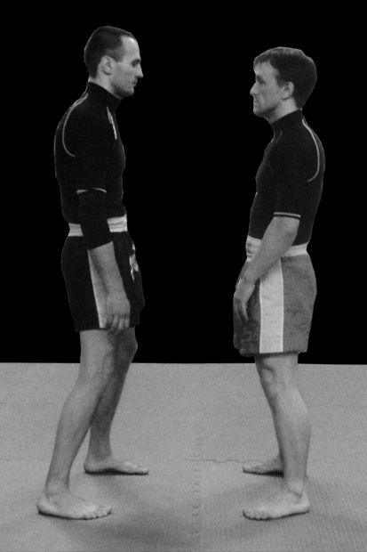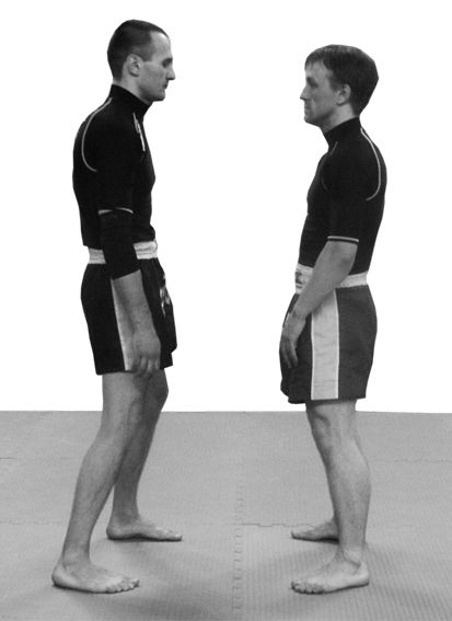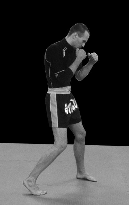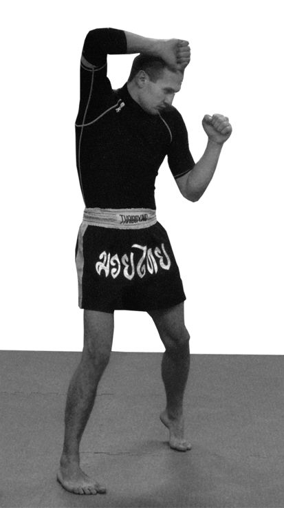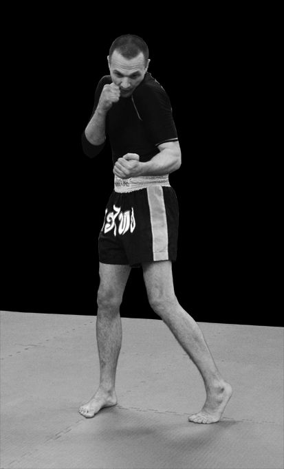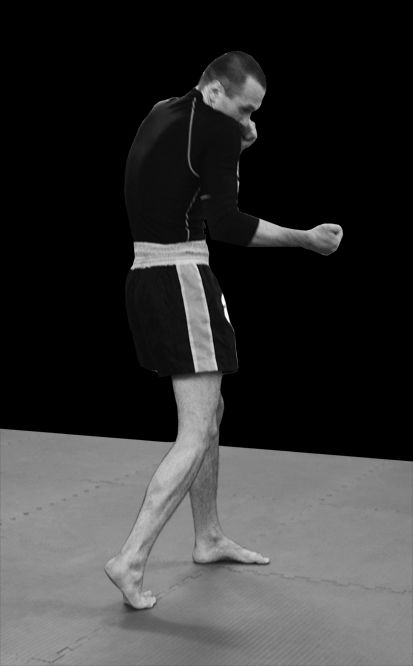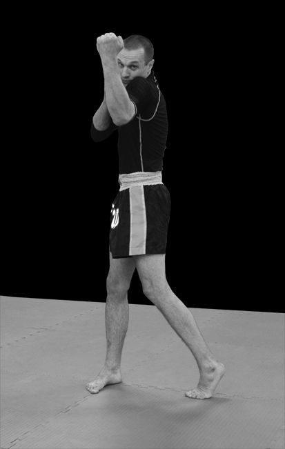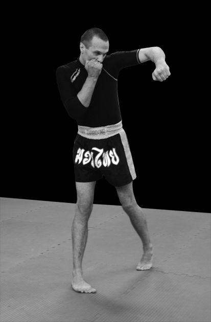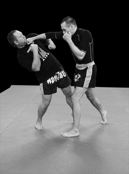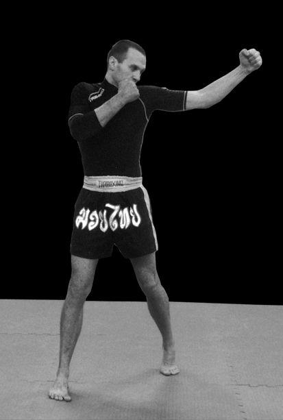 Из стойки № 2 наносим прямой удар левой рукой в область головы противника (рис. 58—60). Перед ударом рука расслаблена, локоть закрывает ребра, кулак прикрывает челюсть. Резко выбрасываем руку по прямой к цели и добавляем импульс от скручивания одноименной стопы внутрь, далее – бедер, далее в него включается весь корпус, и затем через руку усилие передается в кулак. Можно сравнить кулак с тяжелой гирей, а руку – с резиновым жгутом. Мы с резко бросаем гирю, и она летит к цели, бьет ее всей своей мощью и сразу возвращается обратно. Пока кулак не встретился с целью, рука, наносящая удар, расслаблена, и только в момент соприкосновения с целью все части единого целого – стопы, бедра, корпус, рука и кулак – сбрасывают мощный импульс в тело противника. Во время движения руки к цели желательно чтобы ваш локоть был чуть выше кулака, тогда удар пойдет сверху вниз и будет более массивным и пробивающим. Правая рука во время удара левой прикрывает челюсть с правой стороны, с левой стороны челюсть прикрыта плечом левой руки, наносящей удар. После нанесения любого удара очень важен возврат бьющей руки в первоначальную позицию. Возврат должен быть таким же быстрым, как и сам удар.