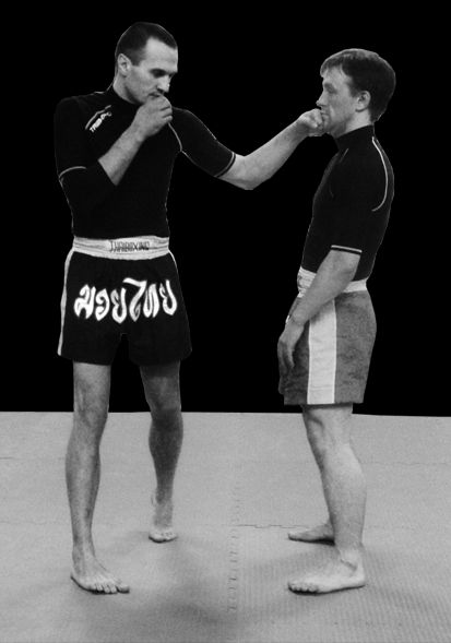 Дополнительную мощь апперкоту придает переброс веса тела на противоположную бьющей руке ногу и распрямление ног в коленях. То есть на конечном участке траектории, перед контактом с целью, нужно как бы приподняться в стойке, делая быстрое разгибающее движение корпусом и одноименной с ударной рукой ногой. При нанесении удара следует следить, чтобы локоть бьющей руки был устремлен вниз, а траектория нанесения удара была почти перпендикулярной полу так, чтобы ваш кулак мог пройти между неплотно сведенными руками противника (рис. 82). После нанесения удара необходимо быстро вернуть руку в первоначальное положение. Удар задней рукой аналогичен удару передней (рис. 83—85). Внезапный удар отрабатывается из стойки № 1 перед зеркалом (рис. 86, 87).