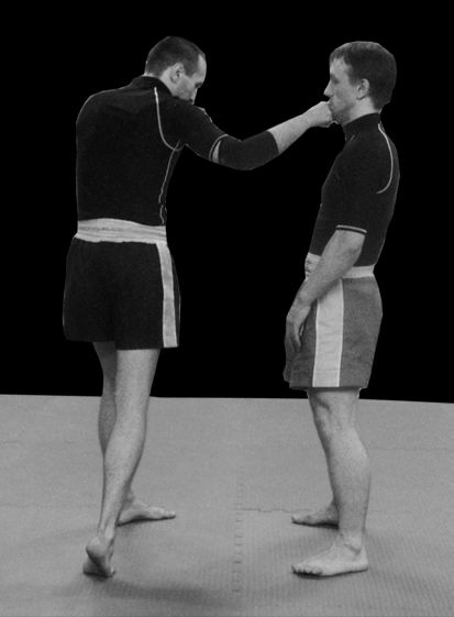 Удар ладонью в пах. Взрывной резкий удар наносится снизу вверх по восходящей траектории апперкота основанием ладони передней руки. Лучше всего этот удар подходит для внезапной атаки или контратаки (рис. 100).
