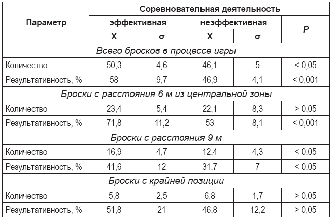 И.Н. Алешин для мужчин (2004) и А.Я. Овчинникова для женщин (2008) предложили фиксировать показатели соревновательной деятельности команды в успешных (выигранных) и неуспешных (проигранных) матчах. В успешных матчах гандболистки выполняли более 50 бросков, а в неуспешных – всего 46,1 броска. Различия количества бросков составили 8 %, а показателей общей результативности – 19 %. Успех игры команде принесло количество и качество выполнения дальних бросков. При этом разница количества бросков в играх разной успешности составила 10 %, а результативности – 25 % (табл. 42).