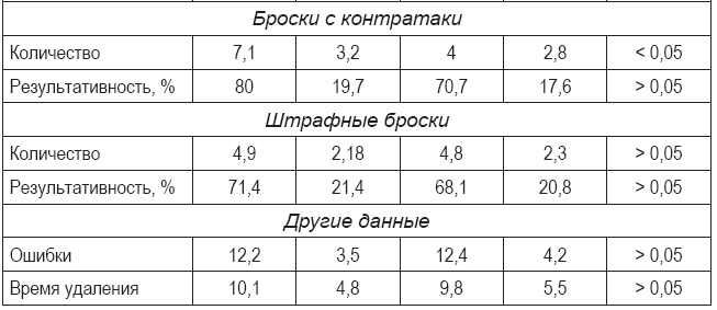 Большое различие – в 25 % – показала результативность бросков с ближней дистанции. Если игроки не забрасывают мяч с близкого расстояния, т. е. один на один с вратарем, то им трудно рассчитывать на успех. В победных играх спортсменки выполняли на 44 % большее количество контратак. Это весьма значительный компонент соревновательной деятельности в гандболе, который способствует успеху. Другие показатели не имели достоверных различий.