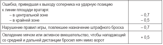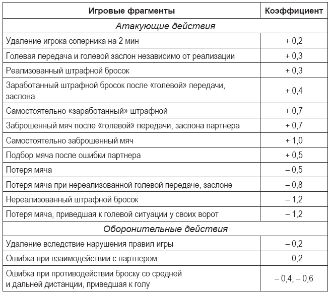 В.И. Тхорев (1999) разработал шкалу коэффициентов для атакующих и оборонительных действий квалифицированных гандболистов, предназначенную для оперативной количественной оценки игровых фрагментов (табл. 43).