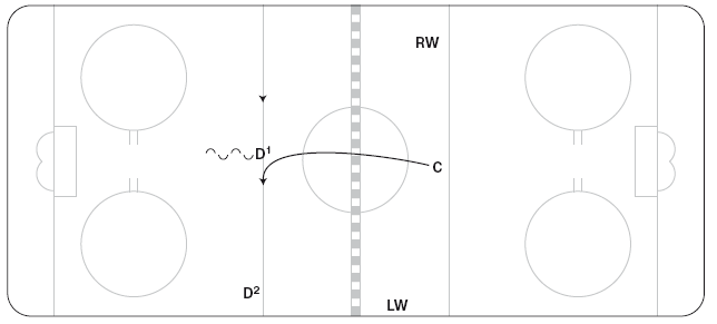 Как правило, тренеры недовольны игроками, которые без необходимости теряют шайбу в двух зонах. Первая занимает 7 или 8 футов (2,1 или 2,4 метра) на чужой половине площадки сразу за синей линией, а другая – 7 или 8 футов (2,1 или 2,4 метра) сразу за синей линией на своей половине льда. Игроки, потерявшие шайбу в названных зонах, скорее всего, узнают о себе много нового. Почему? Когда команда противников перехватывает здесь шайбу, она может быстро перейти в контратаку с численным преимуществом. Так получается потому, что оба не владеющих шайбой форварда зачастую ожидают, что шайба будет отправлена глубоко в зону противника, и, не набирая скорость, располагаются в этой слабой, не готовой к приему шайбы позиции (рисунок 3.1).