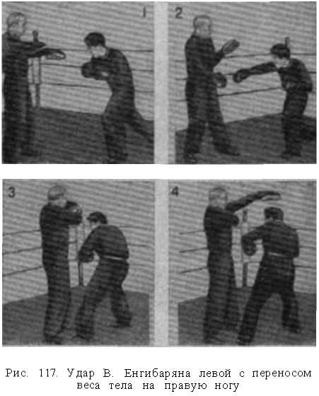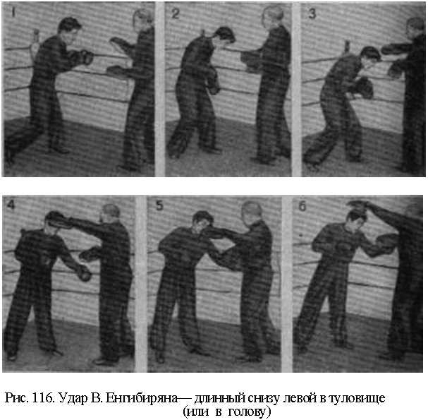 ных костей. Но некоторые боксеры, да и сам Енгибарян, несколько разворачивают кулак так, что удар зачастую приходится головкой пястной кости указательного пальца. Но такое боковое положение кулака опасно, так как, если противник защищается подставкой правого локтя, возможны повреждения головки пястной кости указательного пальца левой руки. У боксеров, наносящих этот удар кулаком, повернутым пальцами вниз, таких травм почти не наблюдалось.
