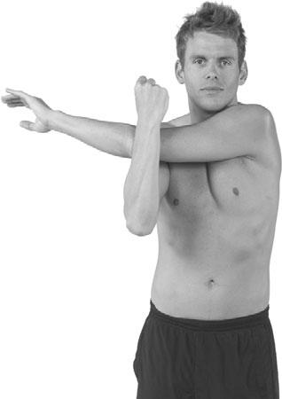 Станьте прямо, ноги на ширине плеч, вытяните левую руку поперек груди. Согните правую руку в локте под углом 90 градусов и поднимите ее верх, плавно подтягивая левую руку к груди. В ходе всего упражнения сохраняйте правильную осанку: спина прямая, плечи разведены. Не округляйте и не опускайте плечи. Удерживайте руку у груди 10 секунд. Вернитесь в исходное положение, смените руки и повторите. Выполнив растяжку на обе стороны, встряхивайте кисти 5–10 секунд.