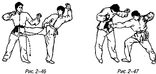 Правая нога опускается впереди образуя правую гунбу, одновременно правая ладонь, пользуясь ситуацией с тыльной стороной в качестве точки приложения силы резко наносит швыряемый удар вперед в пах или живот противника (рис. 2- 47).