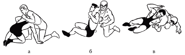 В момент захвата атакующим левой руки снизу контратакующий, упираясь правой рукой в ковер, переводит левую ногу на ступню и приподнимает туловище вверх. Затем он быстро посылает правую ногу под себя до выседа на бедре, а правую руку и голову – под правое плечо атакующего и, поворачиваясь налево, захватывает его левой рукой за правое плечо. Продолжая поворачиваться в левую сторону, контратакующий выходит наверх (рис. 1.77).