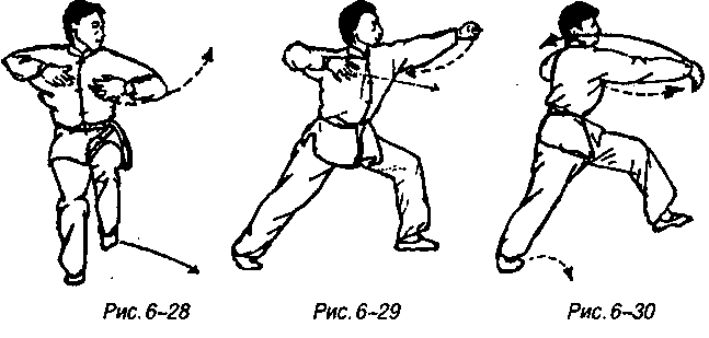 Правая нога чуть приподнимается и туг же с помощью целостной силы всего тела с подошвой в качестве точки приложения силы притоптывает, одновременно правая нога сгибается в колене, тело полуприседает, левая нога поднимается, ладони разделяются перед грудью, смотреть влево (рис. 6-28).