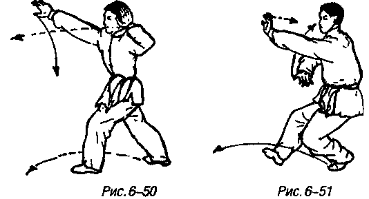 Продолжая предыдущее движение правая нога шагает влево-вперед, носок разворачивается наружу, ноги сгибаясь в коленях полуприседают, правая рука сгибаясь в локте с центром ладони в качестве точки приложения силы нажимает вниз перед животом, корпус тут же поворачивается вправо, левая ладонь принимает округлую форму с опустошенным центром и с кончиками пальцев в качестве точек приложения силы наносит резкий втыкающийся удар вперед, смотреть на левую ладонь (рис. 6-51).