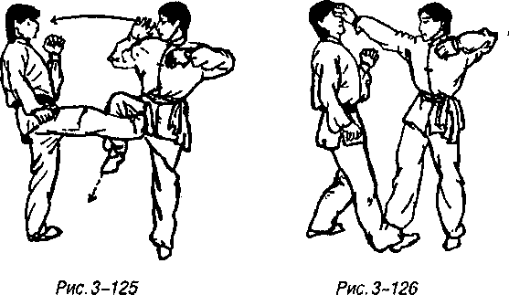 Из позиции для атаки швыряемой ладонью или позиции для разведки дороги рубящей ладонью, когда противник правой ногой наносит дэнтуй в живот или пах, я следуя движению полностью переношу вес тела на левую ногу, а передней поверхностью правой голени подняв колено блокирую влево правую ногу противника, отбивая атаку (рис. 3-125).
