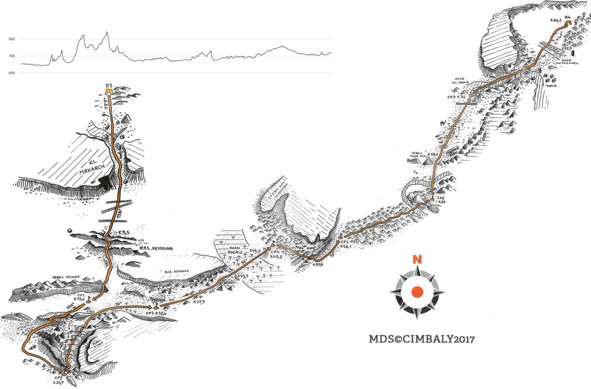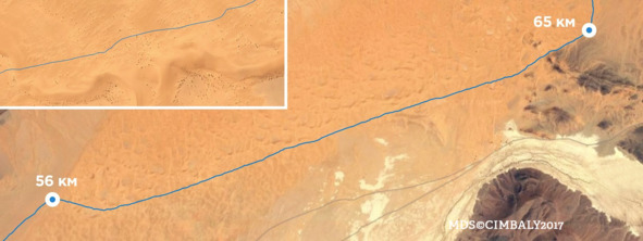 Никакой реакции. Эй! Ладно, попьём тёпленькой водички и закусим горячими гелями. Бррр. И вот мы опять трусим по пустыне. Солнце садится, можно снять шапки и очки. Это хорошо. Но нам предстоит преодолеть девять километров песка без намёка на твёрдую поверхность. И это плохо. Вот так выглядит этот отрезок с высоты птичьего полета.