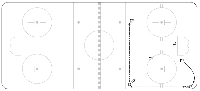 Завладев шайбой в глубине зоны или, возможно, приняв неконтролируемый отскок в углу, владеющие шайбой атакующие игроки делают быструю передачу к цели (от F1 к D1) (рисунок 4.5). Тогда D1 может либо совершить бросок, либо передать шайбу D2, либо отдать пас назад, одному из форвардов. В результате перемещения шайбы из глубины зоны к синей линии образуется разрыв в расстановке обороняющихся игроков, поскольку защищающиеся нападающие пытаются вырваться к своей целевой зоне действий, оставляя пространство между собой и защитниками. Когда все пятеро игроков защищающейся команды находятся в глубине зоны, голевая зона оказывается перегруженной; вынудив крайних нападающих обороняющейся команды выдвинуться ближе к центру площадки, вы освободите место на пятачке.