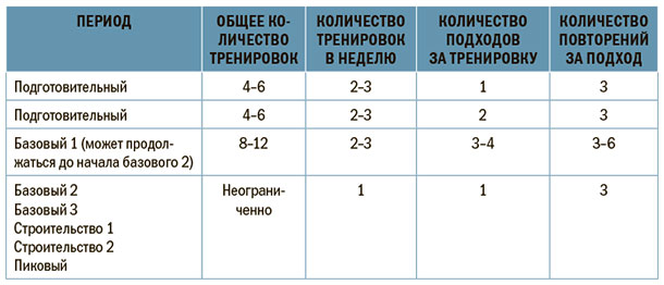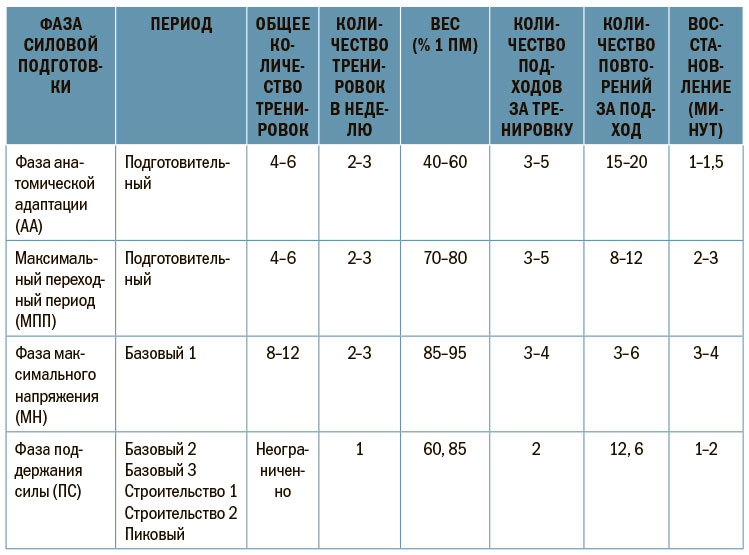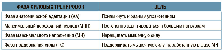 В главе 8 я описывал разные фазы силовых тренировок и показывал, как включить их в сезонный план периодизации. В таблице 13.2 дан краткий обзор этих сведений.