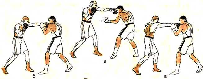 б ) наносим ответный прямой удар левой рукой в голову противника;