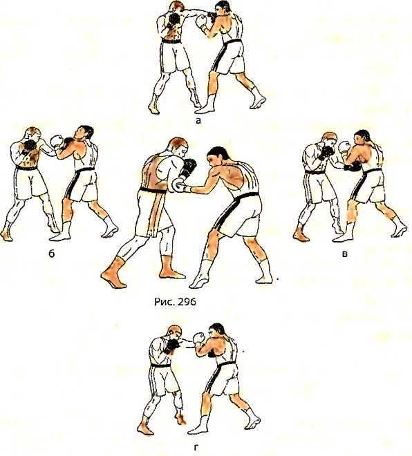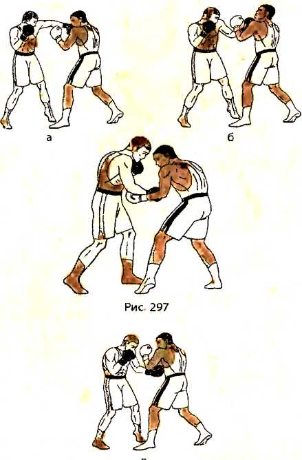 В ответ на удар снизу левой рукой в туловище со стороны противника, отталкиваемся левой ногой и делаем шаг правой ногой назад с последующим подтягиванием левой ноги к правой ноге (рис. 295 - вид справа).
