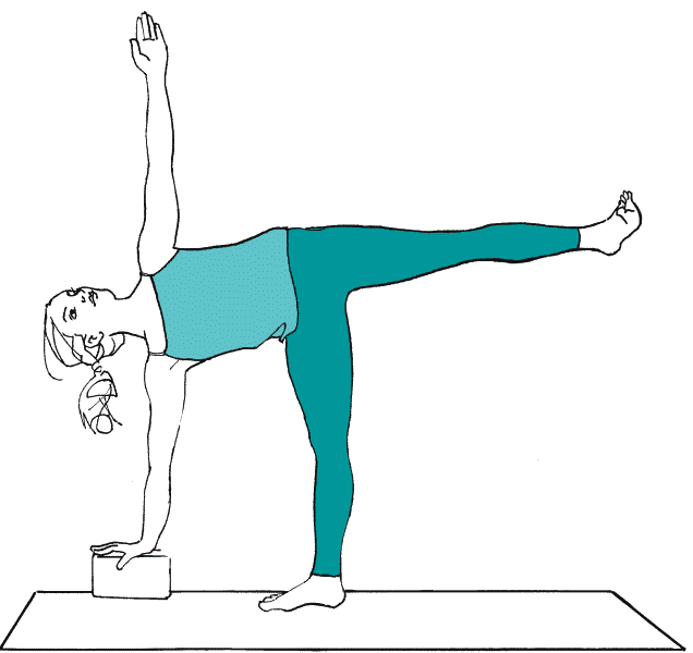 Для начала выйдите в позу вытянутого треугольника (рисунок 8) с наклоном вправо и поместите левую руку на талию. Согните правую ногу в колене и поставьте ладонь или подушечки пальцев правой руки на блок (или на пол) на расстоянии 20–25 сантиметров от мизинца правой стопы. На выдохе выпрямите правую ногу, а левую поднимите параллельно полу, носком вперед.