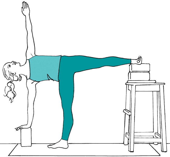 Вариация у стены с блоком и столом. Во время беременности и после любой хирургической операции, когда организму требуется дополнительная поддержка и опора, практикуйте позу полумесяца у стены. Стена помогает правильно и без лишних усилий выстроить положение тела. При выполнении этой вариации голова, таз и задняя поверхность верхней ноги должны касаться стены. Благодаря этому происходит раскрытие грудной клетки, что благотворно сказывается на дыхании. Поместите блок на край коврика, на расстоянии 20–25 сантиметров от носка опорной ноги. Выйдите в позу треугольника с наклоном вправо и положите левую ладонь на талию. Согните правое колено, опустите правую ладонь на блок и выйдите в позу полумесяца. Разверните корпус вверх и прижмите спину к стене. Поднимите левую руку. Если вам сложно оставаться в таком положении, положите поднятую ногу на стол (или другую опору) на одной линии с корпусом (рисунок 10А).