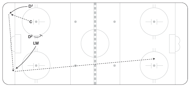 Поскольку вбрасывания имеют такое большое значение во время игры в меньшинстве, они подробно рассмотрены в посвященной данной теме главе 10. Как упоминалось в этой главе, для игроков меньшинства очень важно завладеть шайбой. Бригада меньшинства стремится расстроить игру в численном преимуществе, заставив соперника возвращаться на 200 футов (61 метр) за шайбой, начиная попытку входа в чужую зону заново. Большая часть вариантов вбрасывания представлена в главе 10 (страницы 145–148), однако здесь приводятся две распространенные стратегии, которые стоит использовать после выигранного вбрасывания в зоне защиты.