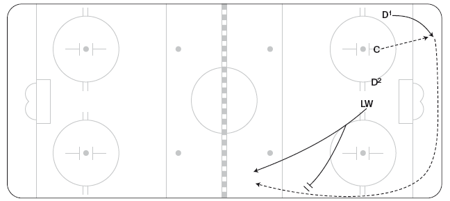В этой ситуации, когда C выигрывает вбрасывание, LW устремляется в глубь зоны в свободный угол (рисунок 11.33). D1 откидывает шайбу LW, а тот выбрасывает ее из зоны. D2 должен создавать заслон перед находящимся внутри зоны крайним нападающим команды противника, чтобы дать LW время завладеть шайбой и забросить ее в глубь площадки.