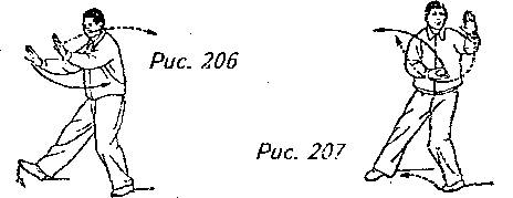 Движение 1 (продолжает рис. 205): Медленно отклоните верхнюю часть корпуса назад, перенесите вес своего тела на правую ногу и поверните ее носок вправо. Одновременно с этим поверните верхнюю часть тела вправо, проведите ладони (правая выше, чем левая) поперек груди вправо пока правая рука не окажется на одном уровне по горизонтали с вашим правым боком, а левая рука (согнутая в локте) не будет прямо перед грудью. Взгляд теперь направлен на правую ладонь (рис. 206, 207).