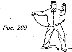 Движение 3: Немного поверните верхнюю часть корпуса вправо, правой ногой сделайте шаг вправо и перенесите на нее центр тяжести тела, переходя на правый “шаг вдоль кромки радуги”. Одновременно с этим поверните правую ладонь от себя и вытолкните ее вправо, чтобы ее пальцы оказались на уровне глаз. Проследите за тем, чтобы руки были слегка согнуты, но плечи опущены, а локти расслаблены. Взгляд по-прежнему направлен на правую руку (рис. 209).