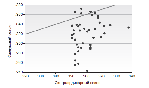 Необычный год показан на горизонтальной оси, а следующий год – на вертикальной: если средний уровень в следующем году ниже, точка окажется под наклонной линией. Регрессия к среднему значению иллюстрируется тем фактом, что почти все точки находятся под наклонной линией, большинство – намного ниже: за выдающимися значениями обычно следуют средние, за экстраординарным – более обычное.