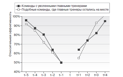 Даже без увольнения главного тренера эффективность контрольной группы также вернулась в норму и как минимум с той же интенсивностью, что и эффективность клубов, уволивших своих главных тренеров. Экстраординарный период плохой эффективности всего лишь является экстраординарным. Эффективность выравняется, как только игроки оправятся от травм, мячи перестанут попадать в штангу или удача снова улыбнется вам. Идея, что увольнение главного тренера является панацеей от болезней команды, – плацебо. Это дорогая иллюзия.