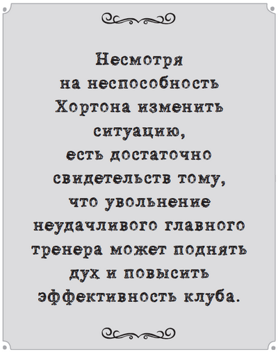 Несмотря на неспособность Хортона изменить ситуацию, есть достаточно свидетельств тому, что увольнение неудачливого главного тренера может поднять дух и повысить эффективность клуба. Это даже было подтверждено исследованиями. Многочисленные изыскания в области увольнений в лигах по всей Европе показали, что эффективность клубов образует кривую с нижней точкой, где нисходящий уклон идет вплоть до увольнения, а затем кривая идет вверх, так как команда снова начинает набирать очки19.