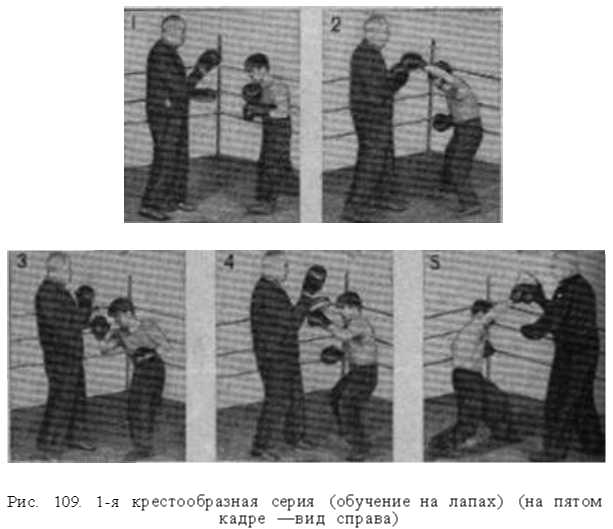 1?я крестообразная серия (рис. 109). Серия начинается ударом левой рукой в голову.