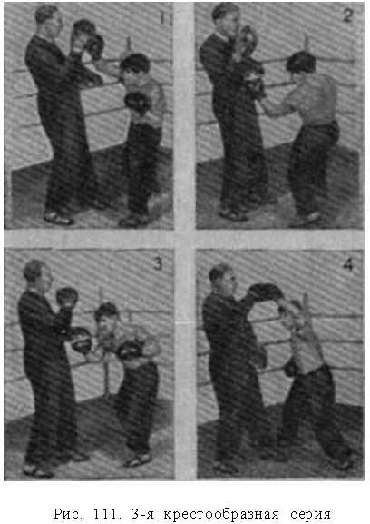 2?я крестообразная серия (рис. 110). Эта серия начинается ударом левой в туловище (крюк, джолт, апперкот) пол шаг левой ногой и с переносом на нее веса тела.