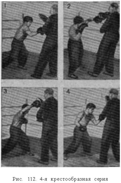 4?я крестообразная серия (рис. 112). Серия начинается, как и первая, с шага вправо правой ногой. Первый удар боксер наносит правой рукой в туловище (апперкот или джолт).