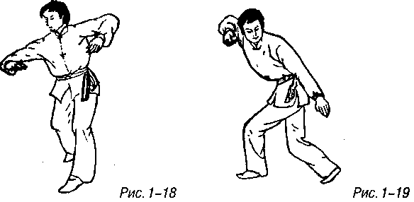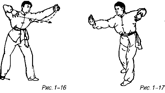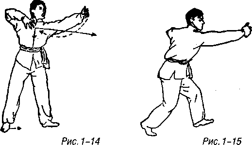 Левая ладонь оттягивается обратно, одновременно корпус поворачивается влево, левая нога сгибается в колене и немного приседает, правая ладонь наносит швыряемый удар вперед или вперед-вниз с тыльной стороной ладони в качестве точки приложения силы, правая нога естественно подшагивает на полшага вперед образуя левую гунгуйбу (рис. 1-15).