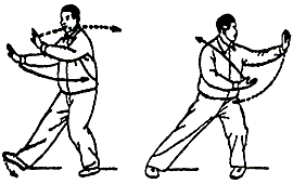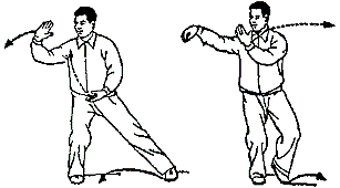 Левая кисть проносится сверху на уровне плеча и выносится в бок ладонью наружу. Правая кисть движется мимо живота к левому боку. Ладонь Правой руки в конечном положении располагается наклонно вовнутрь. Смотреть на левую кисть. (рис. 81–82).