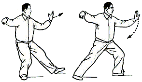 2. Повернуть корпус направо (1 час) и перенести вес на правую ногу. При этом вести правую кисть вправо и вверх до уровня плеча, развернув ладонь в конце движения наружу. Одновременно левая кисть движется по дуге вниз и затем, ми мо живота, вверх до правого плеча ладонью вовнутрь. С началом восходящего движения левой кисти левая нога подносится к правой. При подходе левой кисти к правому плечу правая кисть небольшим поворотом от себя формируется в “крюк” сжиманием кончиков пальцев вместе в направлении к низу. В конечном положении пальцы левой стопы касаются пола. Смотреть на левую кисть (рис. 83–84).