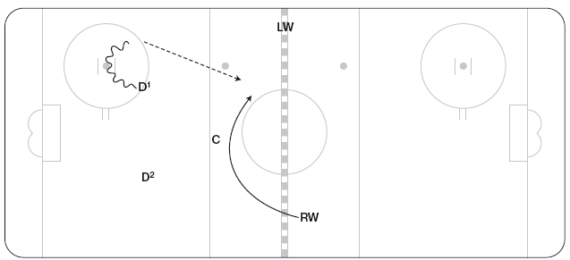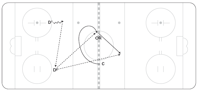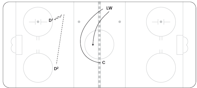D1 осуществляет передачу D2, а затем откатывается в центр площадки, чтобы поддержать партнера. D2 перемещается к центру площадки и ищет возможности для паса. При отсутствии таковых он отдает шайбу обратно D1, который находится позади, в середине площадки. Тогда D1 быстро пасует C, вновь набравшему большую скорость во внешнем коридоре (рисунок 2.23). LW также может быть открыт в центре. В ожидании доступных вариантов для паса D1 может выполнить петлю и разогнаться до середины площадки.