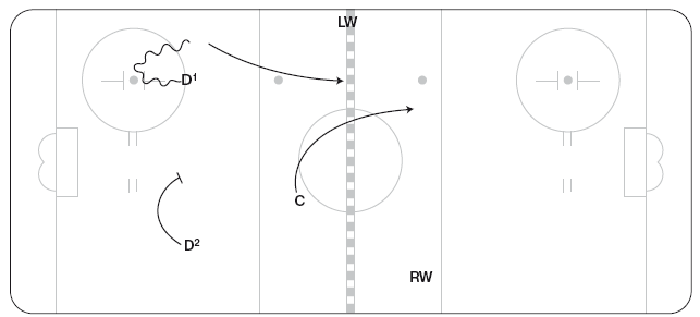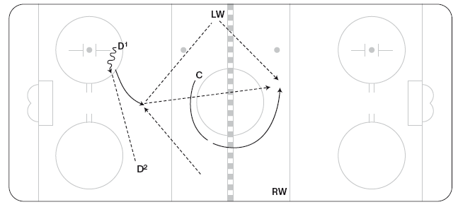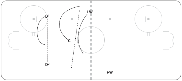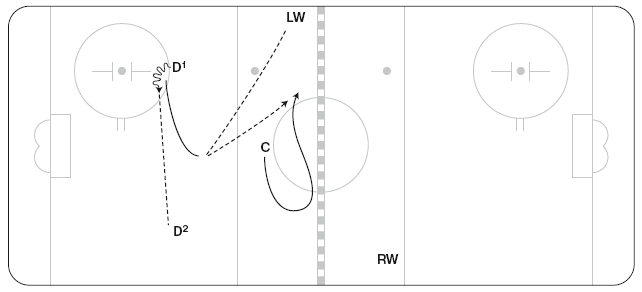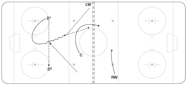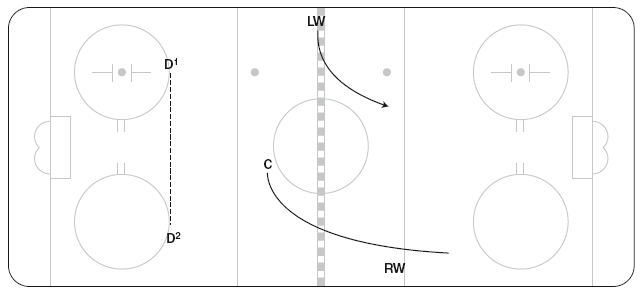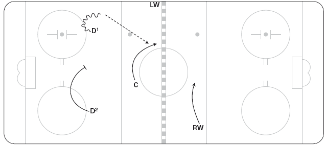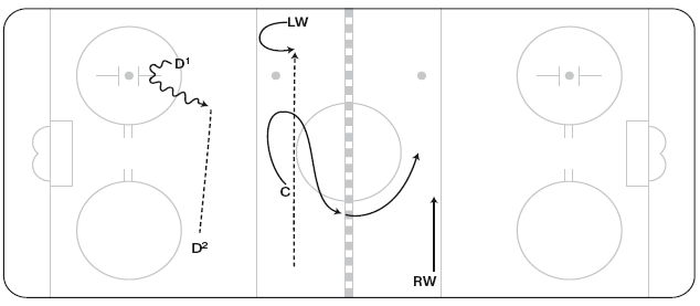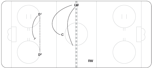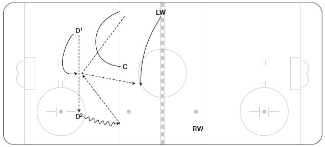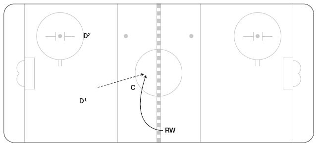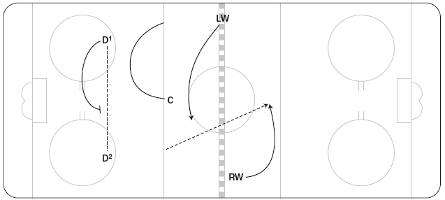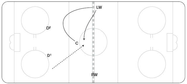В этом случае D1 пересекает с шайбой синюю линию и стремительно разворачивается, передавая пас LW или RW, которые переместились от свободного борта, как только C развернулся к этому флангу (рисунок 2.20). Центральный нападающий должен быстро поменяться местами с RW, чтобы без промедления прийти на подмогу D1.