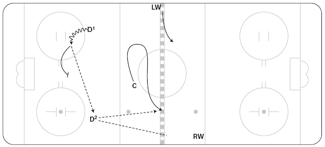 Когда защитник отдает пас нападающему в нейтральной зоне, выполнивший передачу защитник должен быть готов пересечь площадку и поддержать наступление (рисунок 2.18). Партнеры D1 и D2 не должны покидать свои позиции позади наступления в центре площадки на сильном фланге. D1 должен опять же оценить надежность владения шайбой, чтобы определить, насколько далеко и насколько быстро ему нужно переместиться.