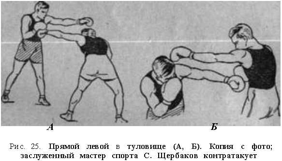 направляет к цели. Кулак повернут пальцами вниз. Правой рукой боксер страхует голову от встречного удара (рис. 25).