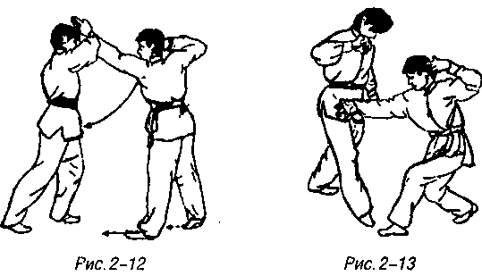 Если противник защищается подпиранием предплечьем вверх, то я, следуя движению, продвигаюсь вперед, приближаясь корпусом, одновременно поворачиваю корпус влево, правая ладонь с тыльной стороной в качестве точки приложения силы наносит вперед-вниз резкий швыряемый удар в пах или живот противник, ноги сгибаются в коленях образуя левую гунгуйбу (рис. 2-13).